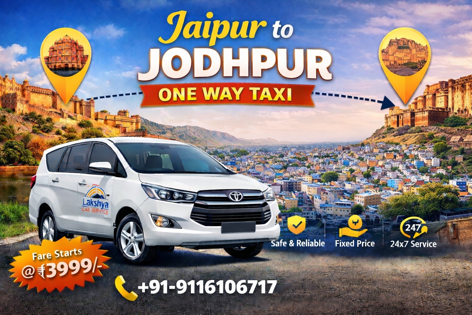 Lakshya Cab Service offers reliable and affordable Jaipur to Jodhpur one way taxi service for tourists, families and business travelers. Jodhpur, also known as the Blue City, is approximately 335 km from Jaipur and the journey takes around 5 to 6 hours by road.